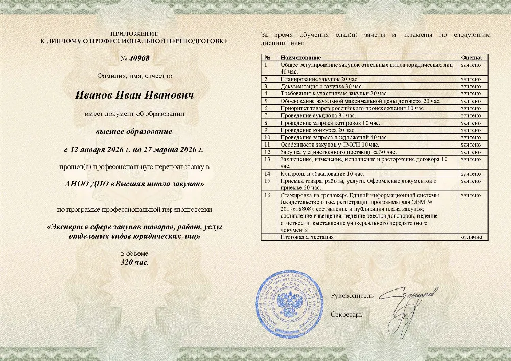 Завершив 320 часов обучения, вы получите диплом о профессиональной переподготовке. Это документ, подтверждающий вашу квалификацию эксперта в сфере корпоративных закупок.